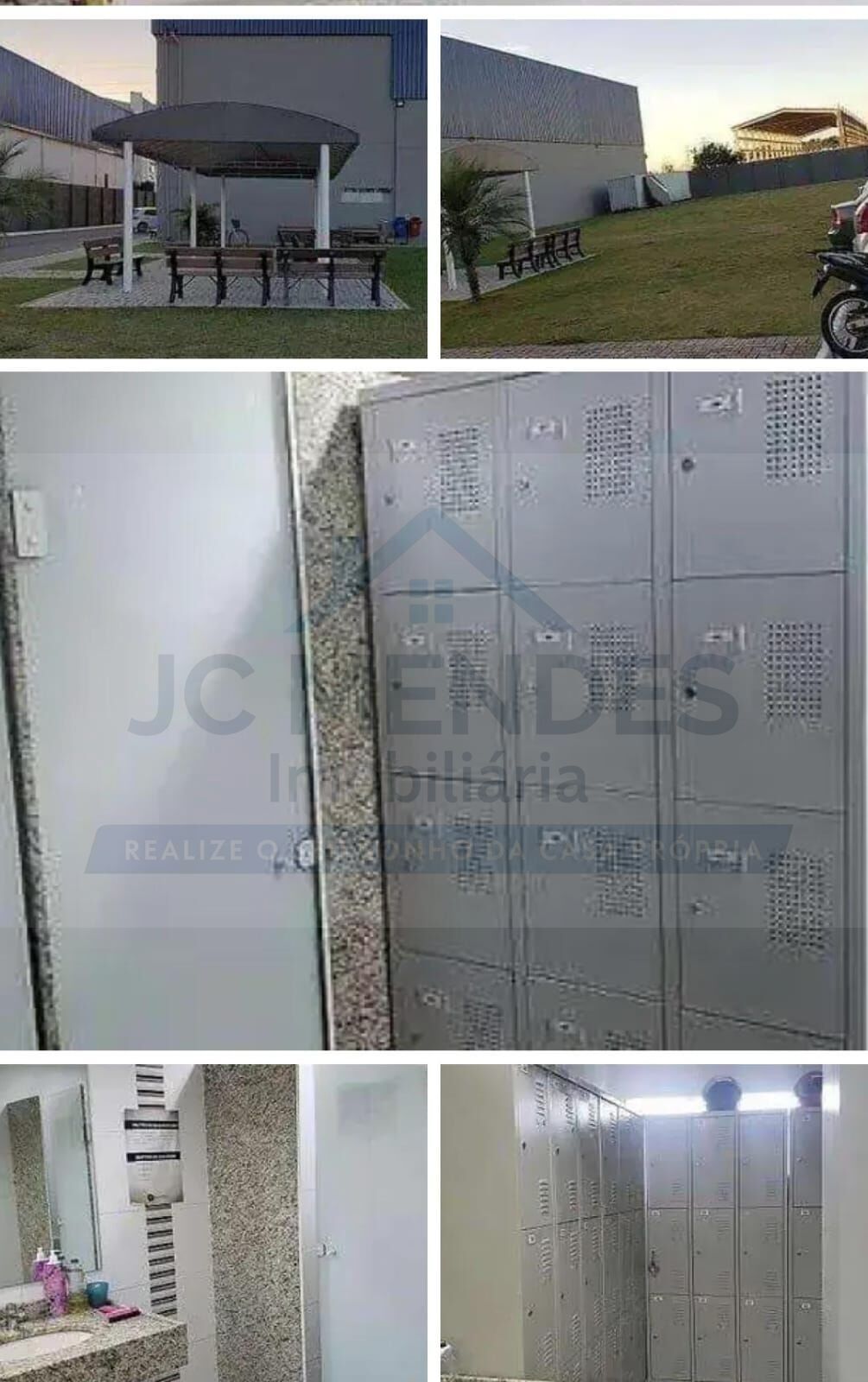 Vestuário masculino e feminino, guarita, campo de futebol.