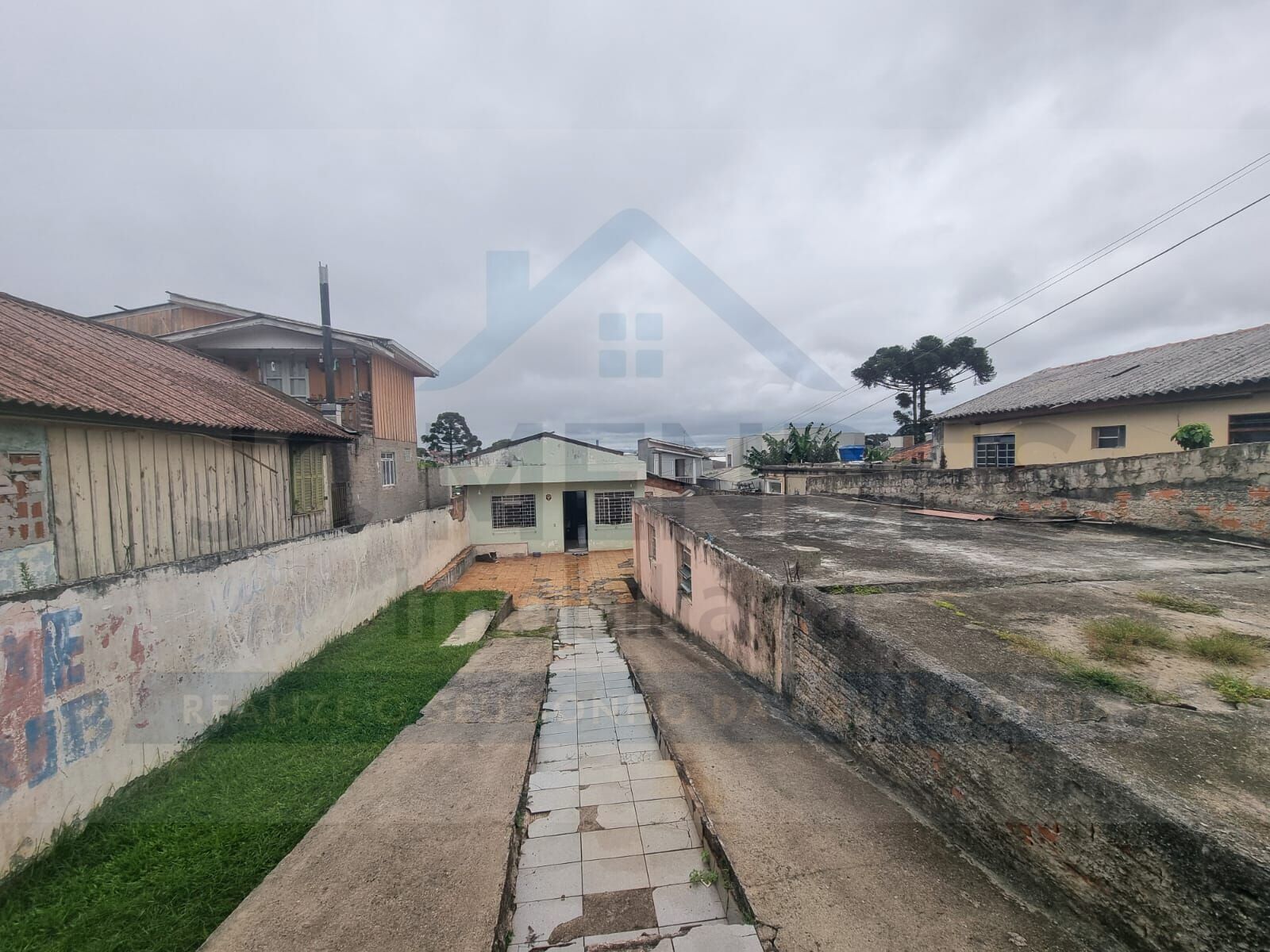 No terreno há uma casa de alvenaria com laje, composta por 3 quartos, sala de estar e jantar integradas, cozinha e demais dependências, que pode ser utilizada para moradia imediata, locação ou apoio durante um futuro projeto de construção.